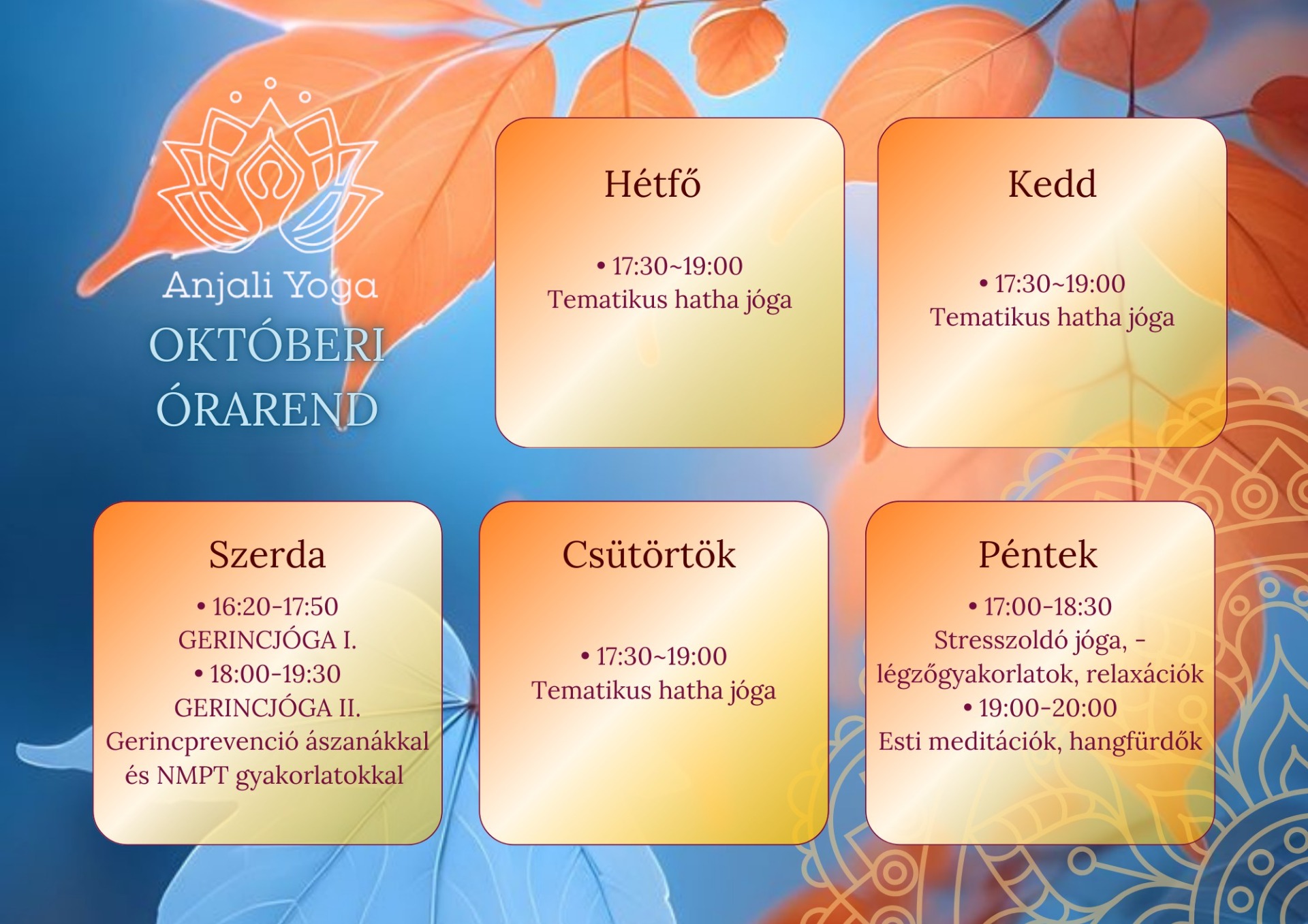 Októberben is szeretettel várlak benneteket az Anjali Yoga terében, ahol a bővített órarendből mindenki megtalálhatja a számára leginkább feltöltő gyakorlást – legyen szó erősítő flow-ról, lazító vagy mélyen regeneráló órákról.