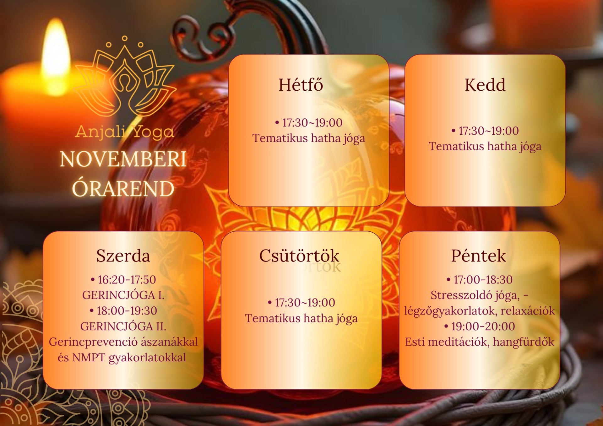 Novemberben is szeretettel várlak benneteket az Anjali Yoga terében, ahol a bővített órarendből mindenki megtalálhatja a számára leginkább feltöltő gyakorlást – legyen szó erősítő flow-ról, lazító vagy mélyen regeneráló órákról.
