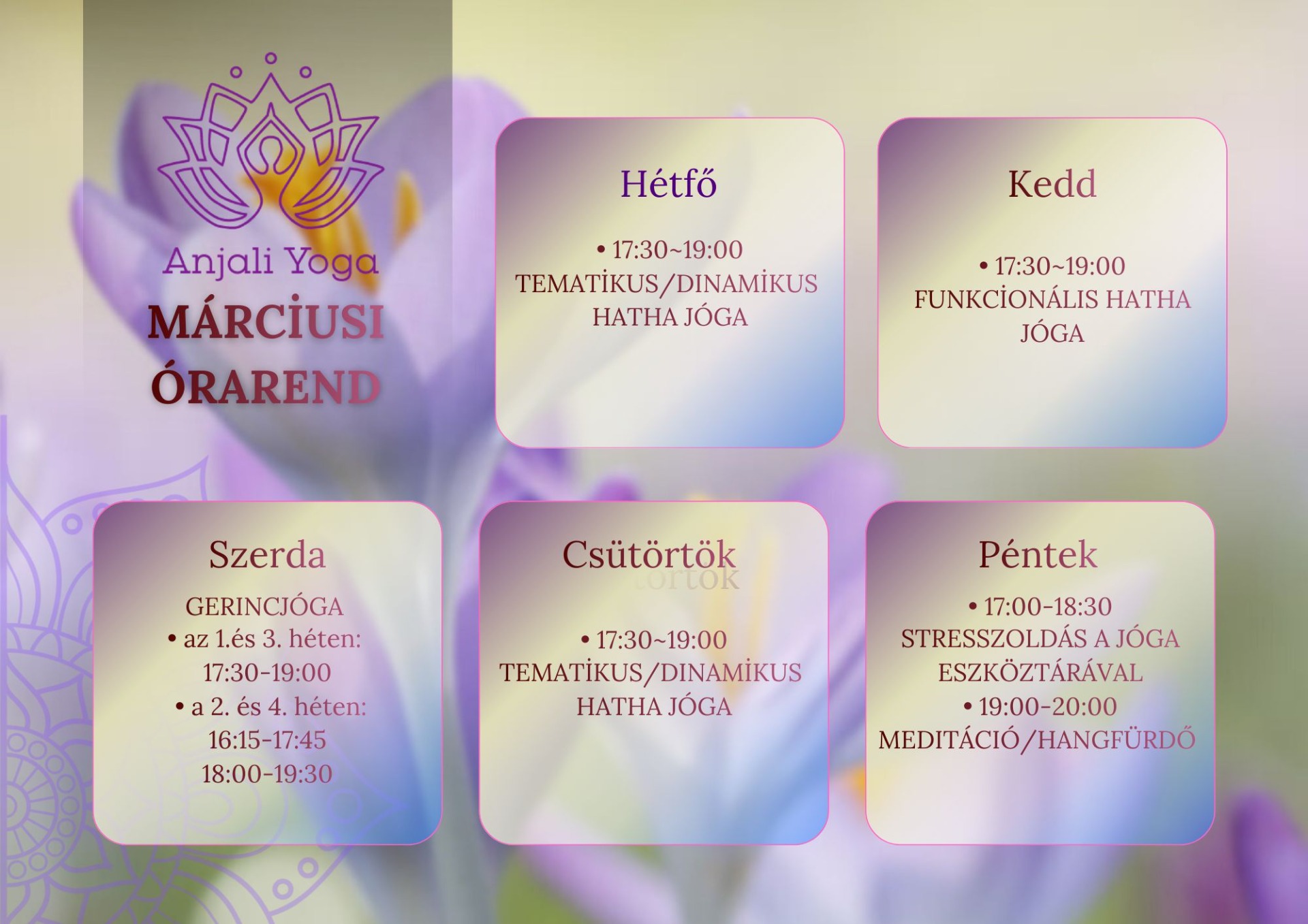 • 03.13-án 17:00 –tól: Stresszoldás a jóga eszköztárával: ászanák, pranayama, 20' vizuális relaxáció hangtál kísérettel;